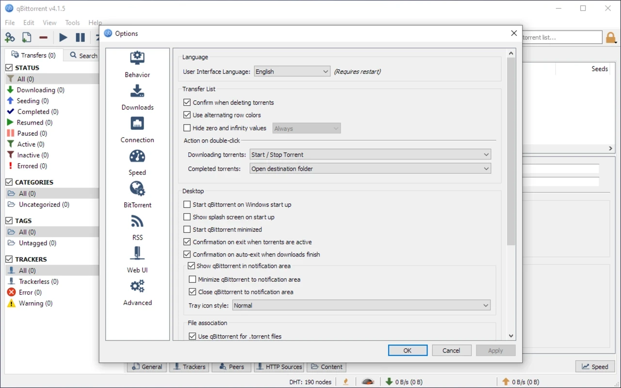 ユーザーフレンドリーなインターフェースはすっきりとしており、アイコン型のトップツールバーを備えたuTorrentに似ています。Torrentリンクの追加、Torrentファイルの追加、削除、再開、一時停止、設定など、複数の機能を備えています。設定メニューには、関連するアイコンで明確に区別された、一般的な機能がすべて揃っています。